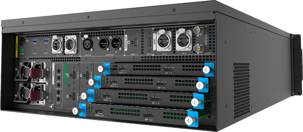 • Plug-in and modular design for higher system stability • Infinite device cascading, synchronized by Genlock • Frame sync technology for synchronized and smooth display • Seamless primary and backup device switching safeguards your on-site operation • 10 Gigabit Ethernet • EDID lock, ensuring no jump of connector resolution and display sequence • Intelligent thermal solution • Dual redundant power • Running status monitoring and fault alarm via LCD display on front panel • High quality XLR audio inputs and outputs • Remote or central control via TCP/UDP protocol • Pass stress and stability tests • 4U rack mountable chassis • Industrial ruggedized design |