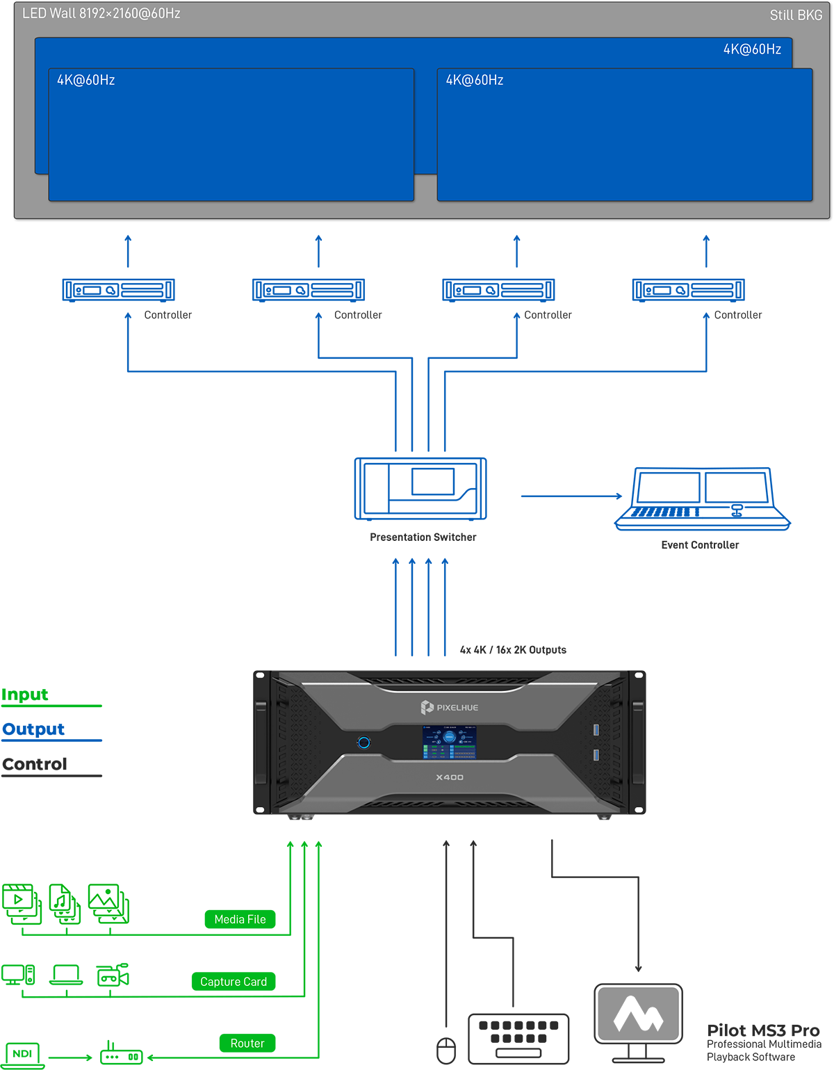 The X400 (G1) is a professional media server engineered by PIXELHUE. Equipped with Intel’s latest-generation processor, high-performance server class motherboard and graphics card, multiple input and output cards, the X400 (G1) can drive up to 4x 4K or 16x 2K outputs from a single server unit, thus delivering unprecedented high performance to your various large-scale events today.