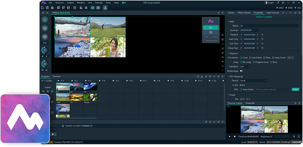 The X400 (G1) media server comes equipped with the Pilot MS3 Pro multimedia playback software, perfect for bringing your creative ideas to life. It supports innovative slices, ultra-wide videos, and flawless pixel-to-pixel displays, enabling dazzling visual effects for spectacles or live events, and allowing you to fully unleash your creativity. With geometric correction, projector edge blending, and timeline management functions, alongside features like live and pre-edit modes, unlimited layers and programs, program jumping and media collection playback, customized cross-program playback, image quality adjustments, and crossfade effects, you'll have powerful tools to easily and flexibly manage and control your event displays.